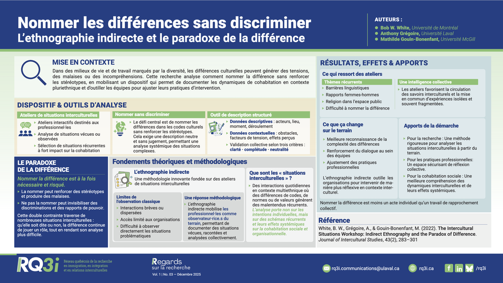 L’objectif principal de cet atelier est de faciliter la mise en commun de ce que les différents acteurs du milieu voient comme situations problématiques récurrentes en contexte interculturel. La réflexion proposée par l’atelier cherche à offrir des réponses aux trois questions suivantes :